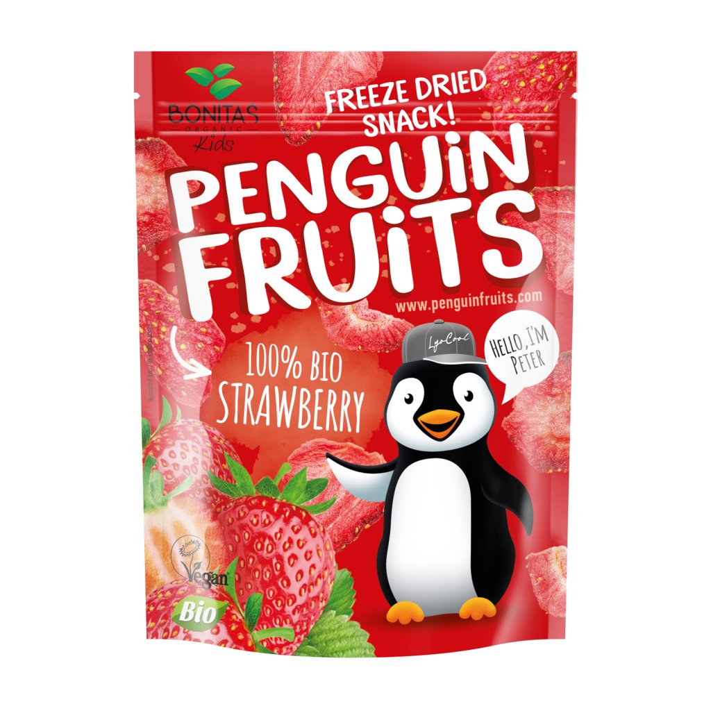 Vyměňte nezdravé snacky za Penguin Fruits s lahodnou příchutí sladké jahody. Čerstvé jahody v BIO kvalitě jsme sušili mrazem, aby zůstaly dlouho křupavé a zároveň si uchovaly všechny důležité vitamíny.