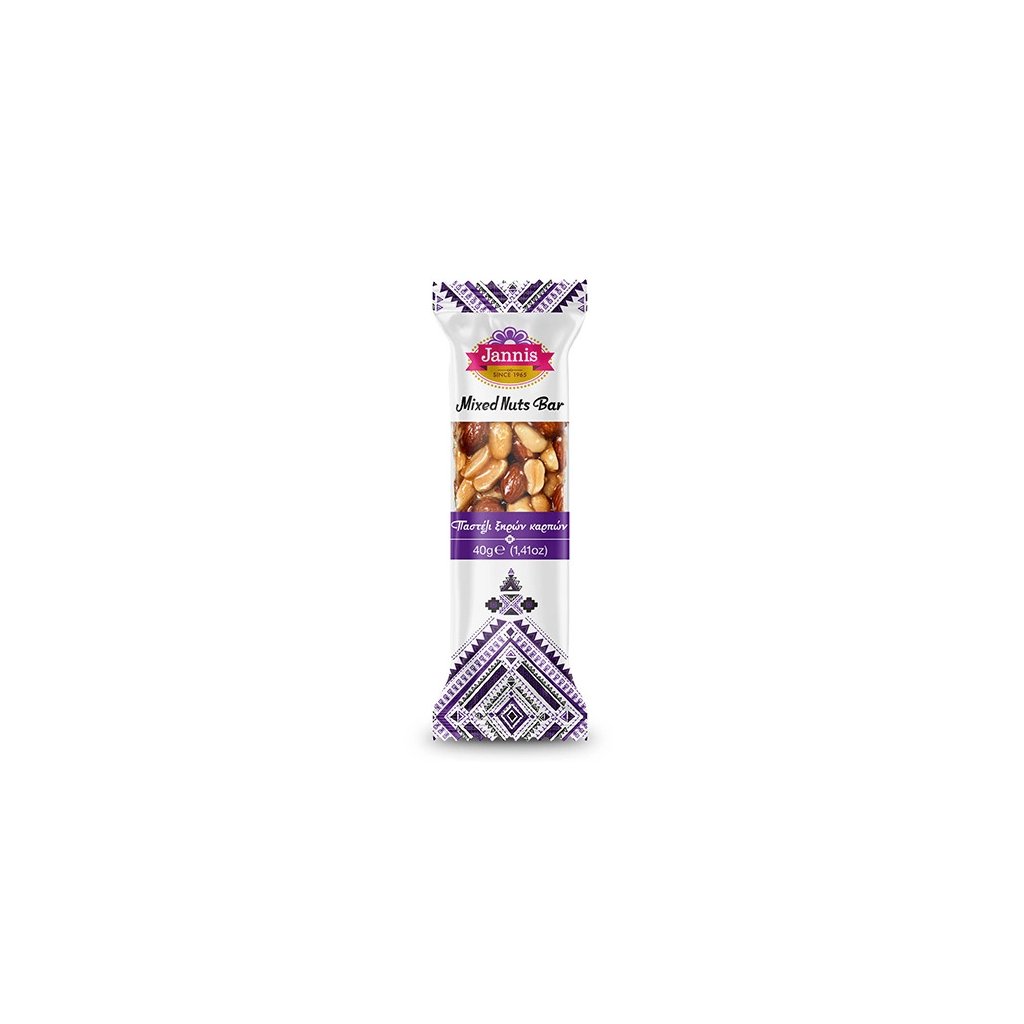 Řecká ořechová tyčinka JANNIS kombinuje lahodnou směs mandlí, lískových ořechů a arašídů zalitých jemným karamelem. Křupavá struktura a přirozeně sladká chuť dělají z této tyčinky ideální svačinku během dne.