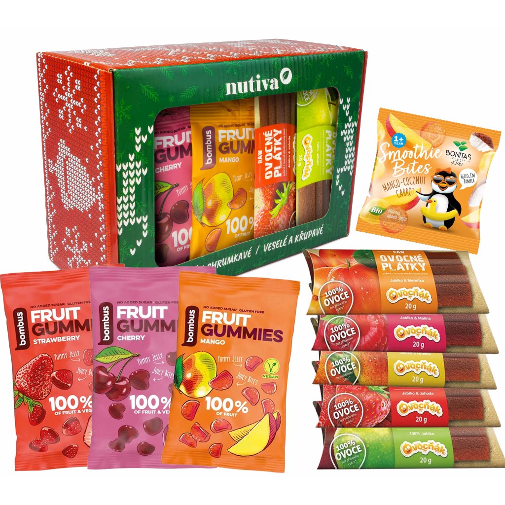 Mikulášský Box – hravý mix od Nutivy je barevný a svěží mix ovocných dobrot, který spojuje chuť čistého ovoce a vánoční radosti. Najdeš v něm pět příchutí ovocných plátků Ovocňák a ovocné bonbony Bombus ve třech oblíbených variantách – jahoda, mango a třešeň.