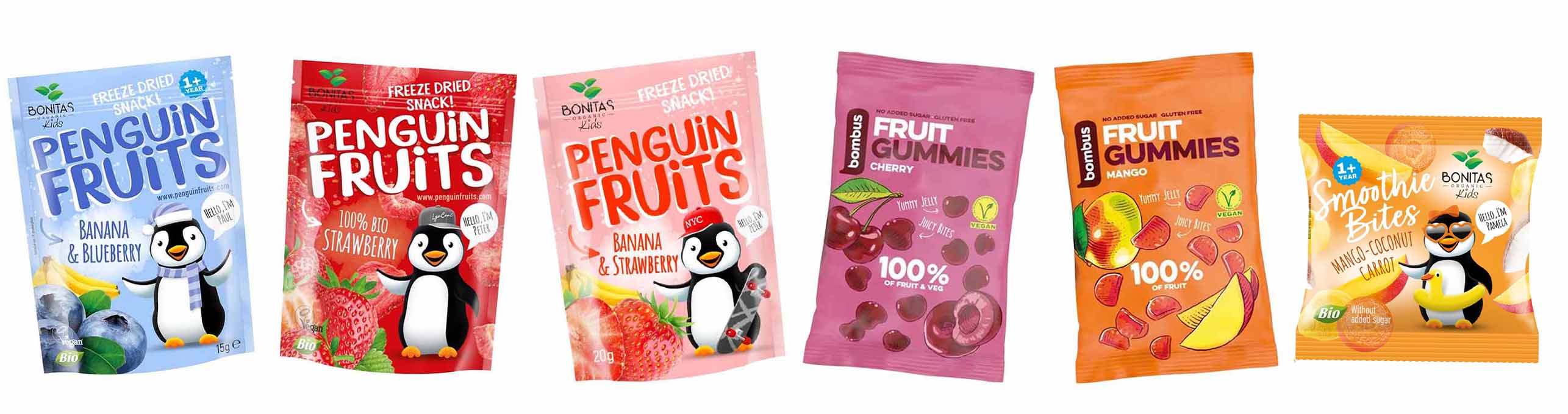 - Bonitas BIO Penguin Fruits Banán & Jahoda (15 g) – jemně sladká kombinace oblíbených druhů ovoce v BIO kvalitě.