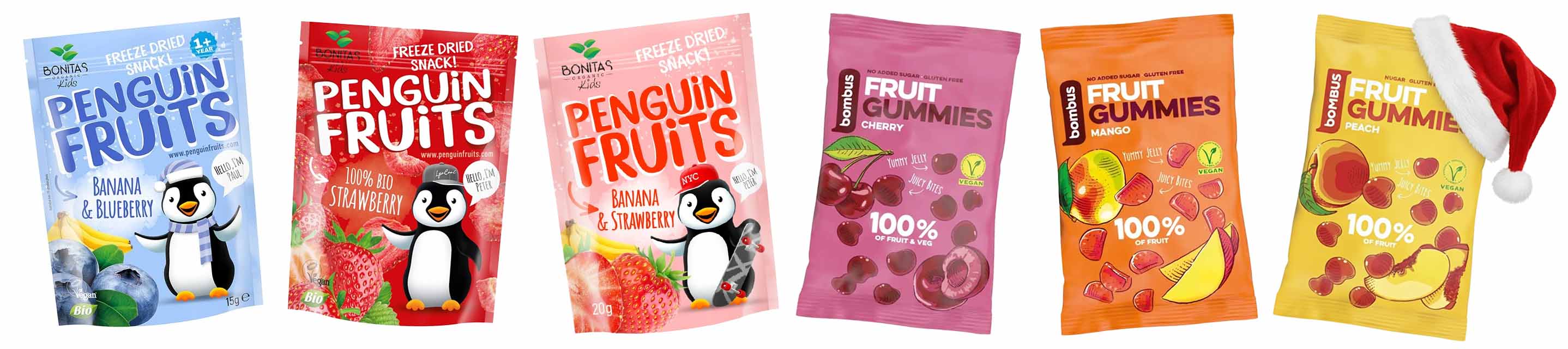 Letos Mikuláš vynechal čokoládu a přinesl ovoce. Penguin & gummies je mikulášský box plný barev a ovocných vůní. V krabičce najdeš mrazem sušené BIO kousky Penguin Fruits od Bonitas a měkké ovocné bonbony Bombus s chutí třešně, manga a broskve.