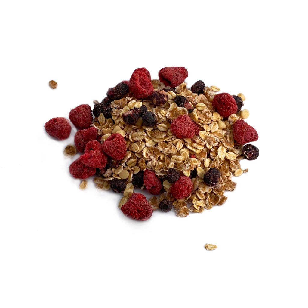 - Složení: ovesné vločky 62%, pšeničné lupínky opékané 20%, bílá čokoláda 13% (cukr, sušené plnotučné mléko, kakaové máslo, sušené odstředěné mléko, emulgátor: sójový lecitin, přírodní vanilkové aroma), ovoce 5% (maliny sušené mrazem, borůvky sušené mrazem )